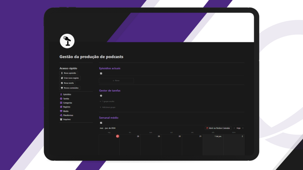 Leve seu podcast para o próximo nível com o modelo "Gestão de produção de podcast" do Notion!