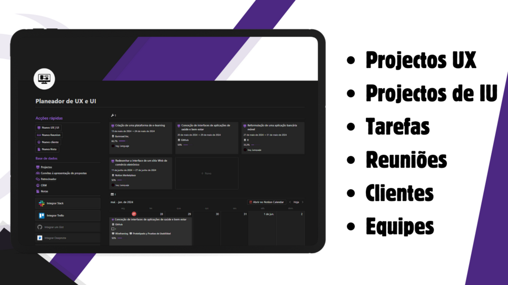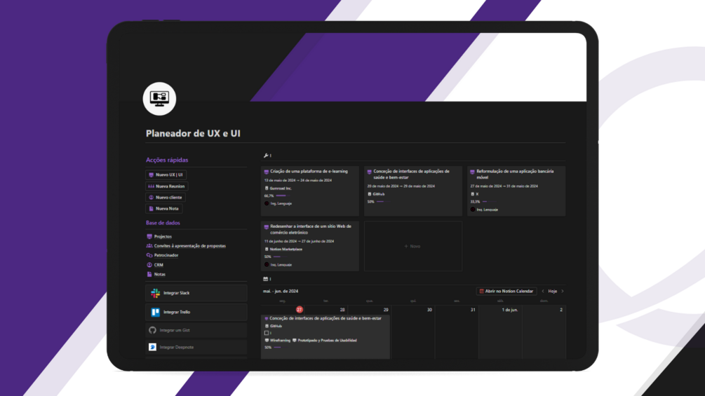 Imagine ter todos os seus projectos, tarefas, clientes e reuniões de UX e UI organizados num único local, sem a confusão de várias ferramentas e notas dispersas. Com o nosso modelo, a gestão do seu trabalho será mais fácil e clara, permitindo-lhe concentrar-se na criação de experiências de utilizador excepcionais.